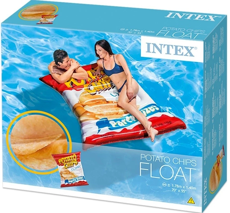 Intex Φουσκωτό Στρώμα Θαλάσσης Πατατάκια Φουσκωτό στρώμα θαλάσσης ενηλίκων σε σχήμα πατατάκια Διαστάσεις: 178×140 εκ Μέγιστο βάρος: 100 kg ΠΡΟΣΟΧΗ: Το προϊόν δεν προστατεύει από πνιγμό. *Περιέχεται κομμάτι επιδιόρθωσης