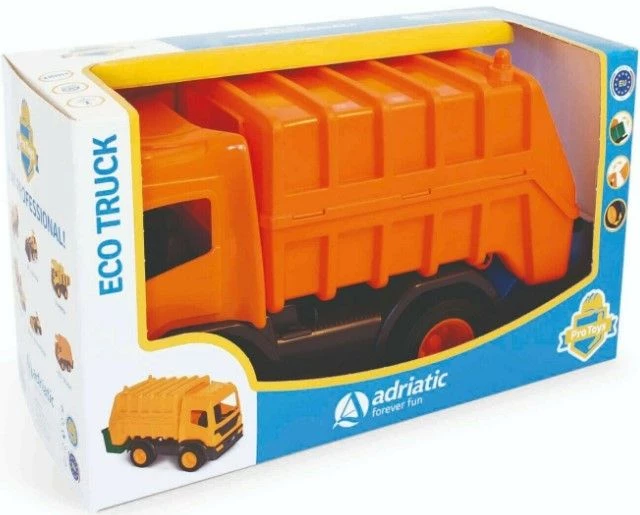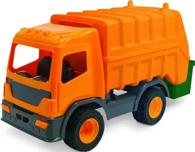 Καλοκαιρινό Adriatic Απορριματοφόρο Πορτοκαλί Πορτοκαλί απορριματοφόρο με καουτσούκ ρόδες, πτυσόμενο το πίσω μέρος, φορτωτή και κάδο απορριμάτων για διαδραστικό παιχνίδι.