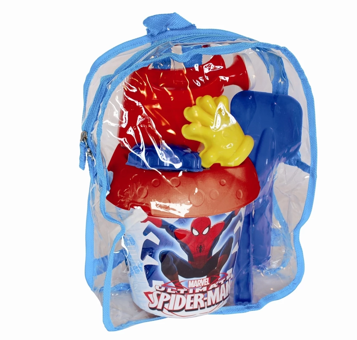Καλοκαιρινό adriatic κουβαδάκι Spiderman σε τσάντα διάφανη. Το σετ περιλαμβάνει: Κουβαδάκι (30 εκατοστών) με καπάκι κόσκινο, Ποτιστήρι, Τσουγκράνα, Φτυαράκι, 2 κουπάτ.